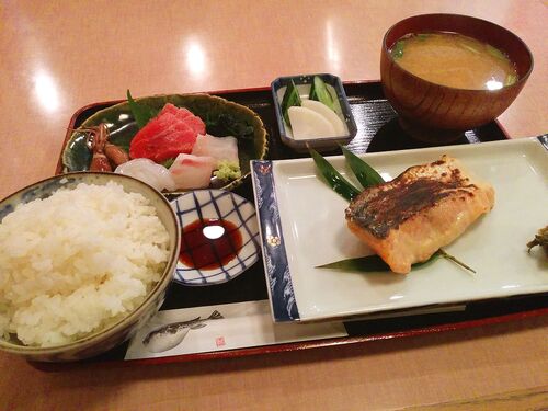 昼の桜も愛でにゆきます。 そしてランチ。千ふじで天丼じゃないメニューも試してみることに。 焼き魚定食と海鮮丼です。どちらもランクが上の1500円のやつを注文。 ……うはぁ、うまそう。ていうか食ってもうまい。 焼き魚は鮭の西京焼きですが身が厚い。どっ…