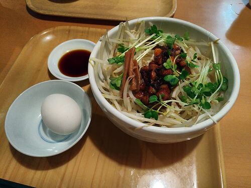 20190204 月曜はまぜそばの日、らしいです。ということで限定のまぜそばを。鮭とチーズっぽいですね、画像的に。追い飯は梅のきいた和風のものをチョイス。とてもおいしかった記憶があります。平打ち太麺がうまい。